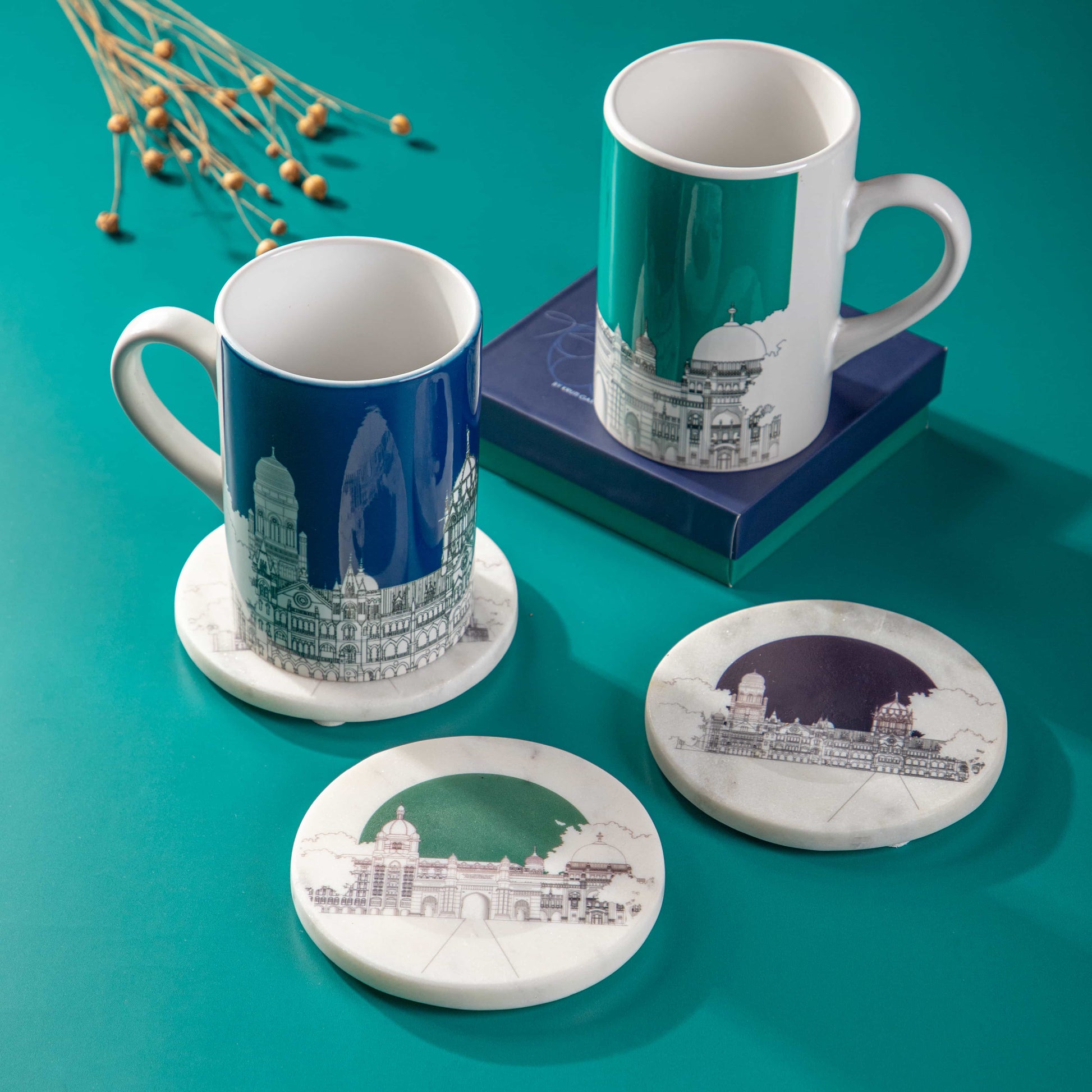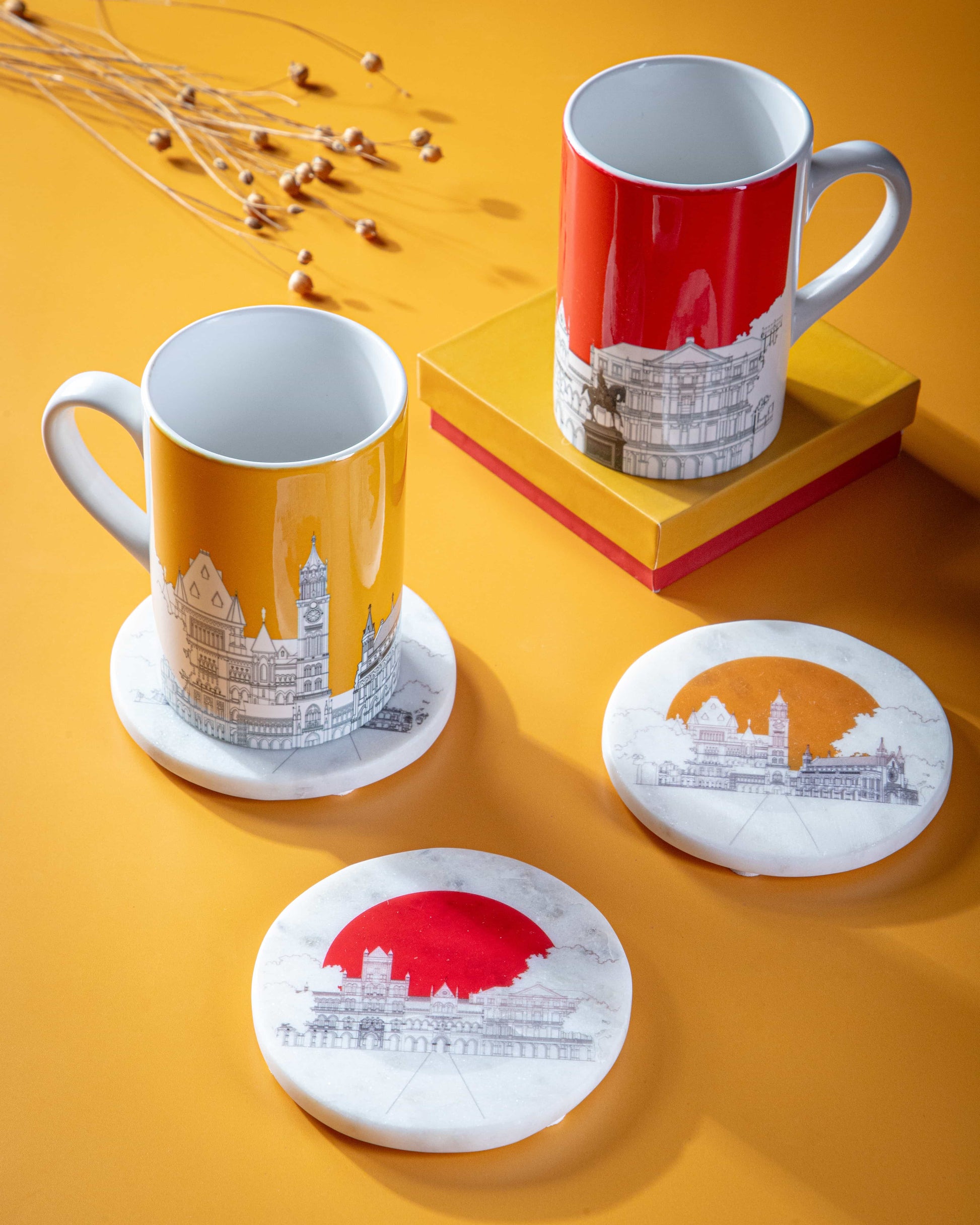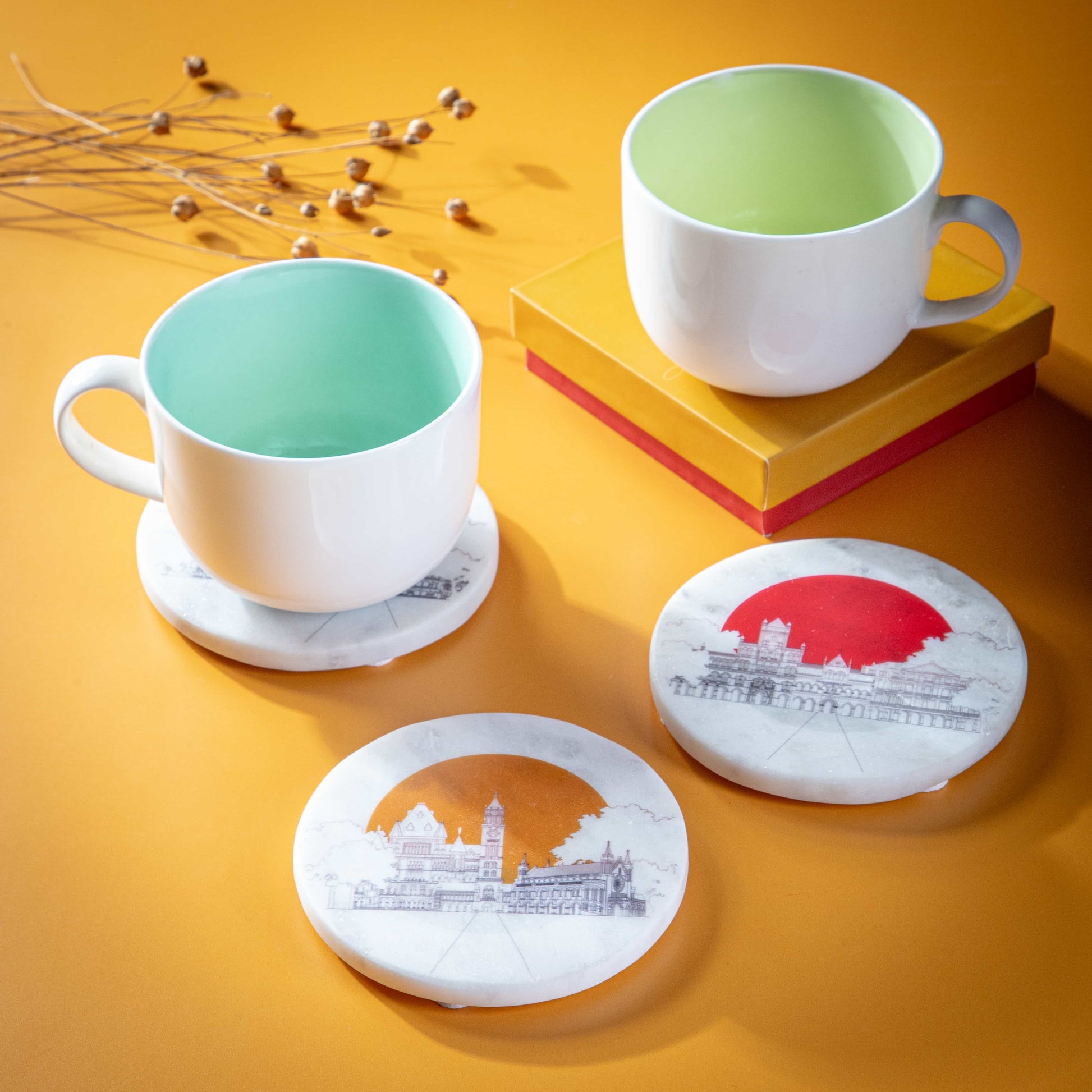 Design: Each coaster features intricate black and white illustrations of Mumbai's heritage, brought to life with striking bold pop colors.